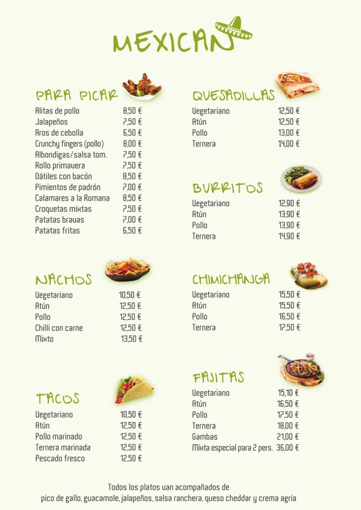 Si desea pedir comida mexicana, le agradeceríamos que nos lo comunique con antelación, hay posibilidad de no estar disponible